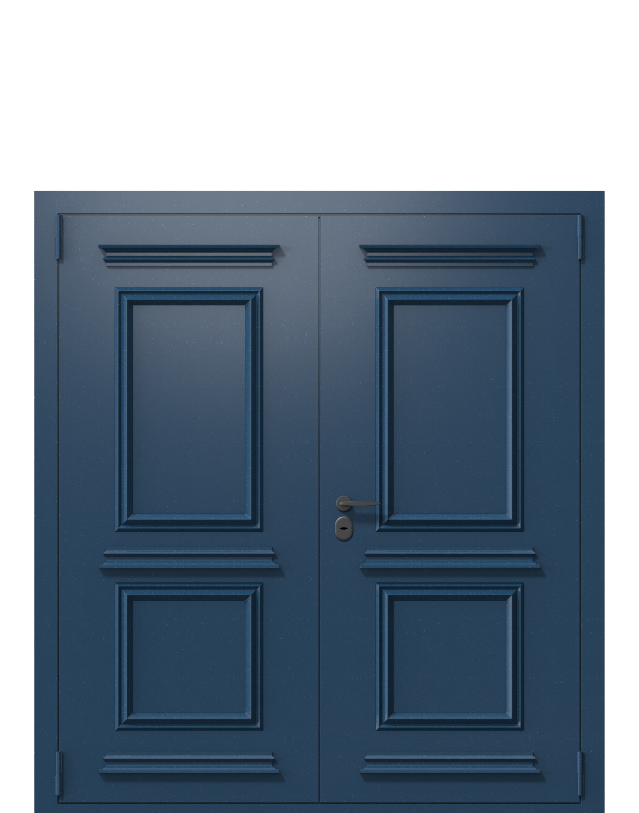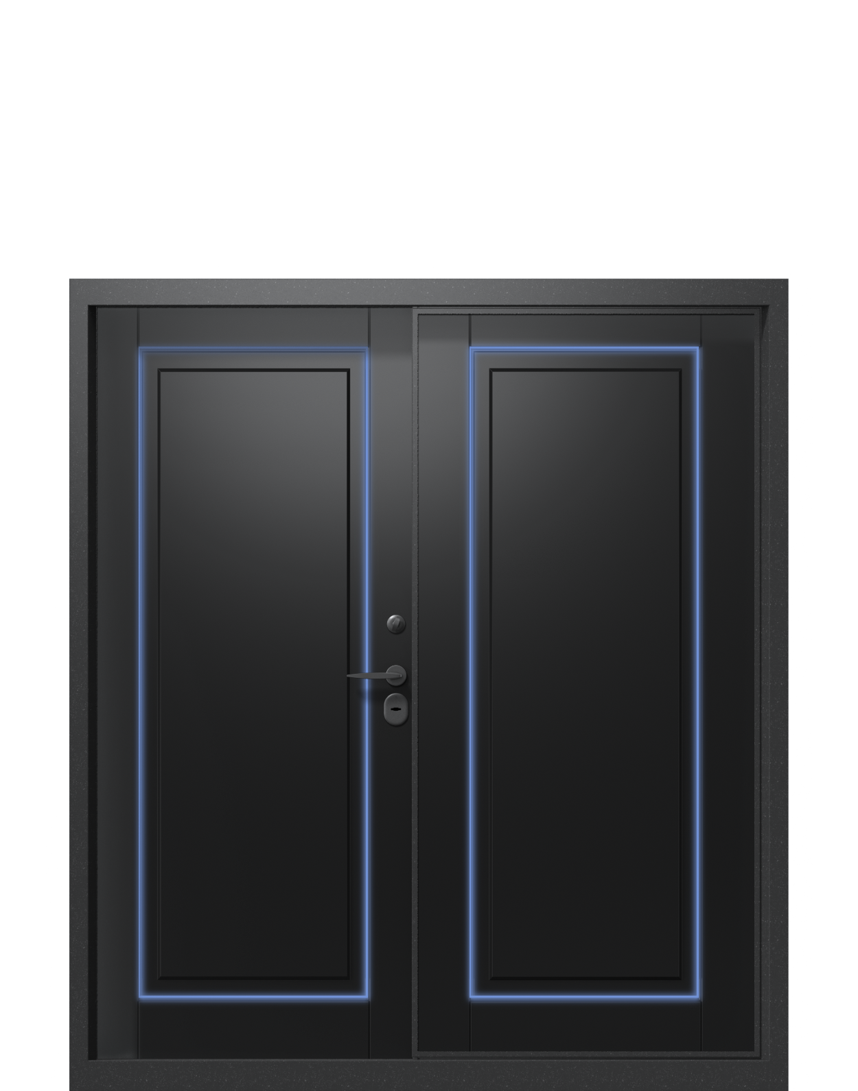 Внешняя металлическая сторона двери в оттенке “Del Mare” декорирована багетной раскладкой. Насыщенный сапфировый цвет оттеняет черная матовая фурнитура. Внутри дверь украшена ПВХ покрытием в цвете “Черный матовый” и прямоугольной фрезеровкой. По рисунку фрезеровки проложена синяя светодиодная лента, которая выделяет темный цвет внутреннего полотна и подчеркивает цвет внешней стороны.