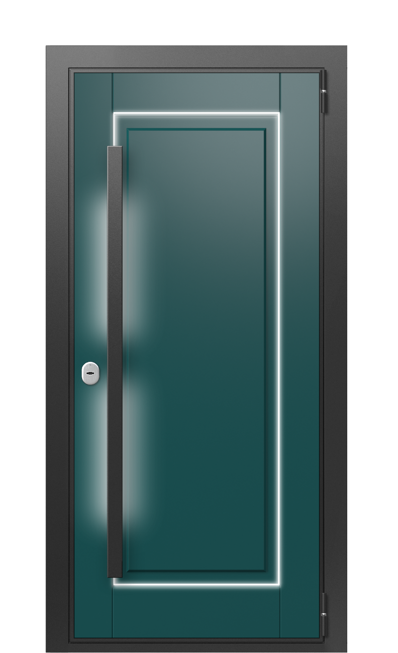 Входная дверь в коттедж с подсветкой TermoWood Зеленое сукно, Дуб винтаж - контрастная модель в эко-стиле в современном исполнении. Дизайнерская фишка двери - встроенная подсветка по контуру короба, по рисунку фрезеровки и в дизайнерской ручке Rettangolo. Светлый цвет светодиодного свечения ярко выделяет панель “Зеленое сукно”и цвет короба в оттенке Vesuvio.