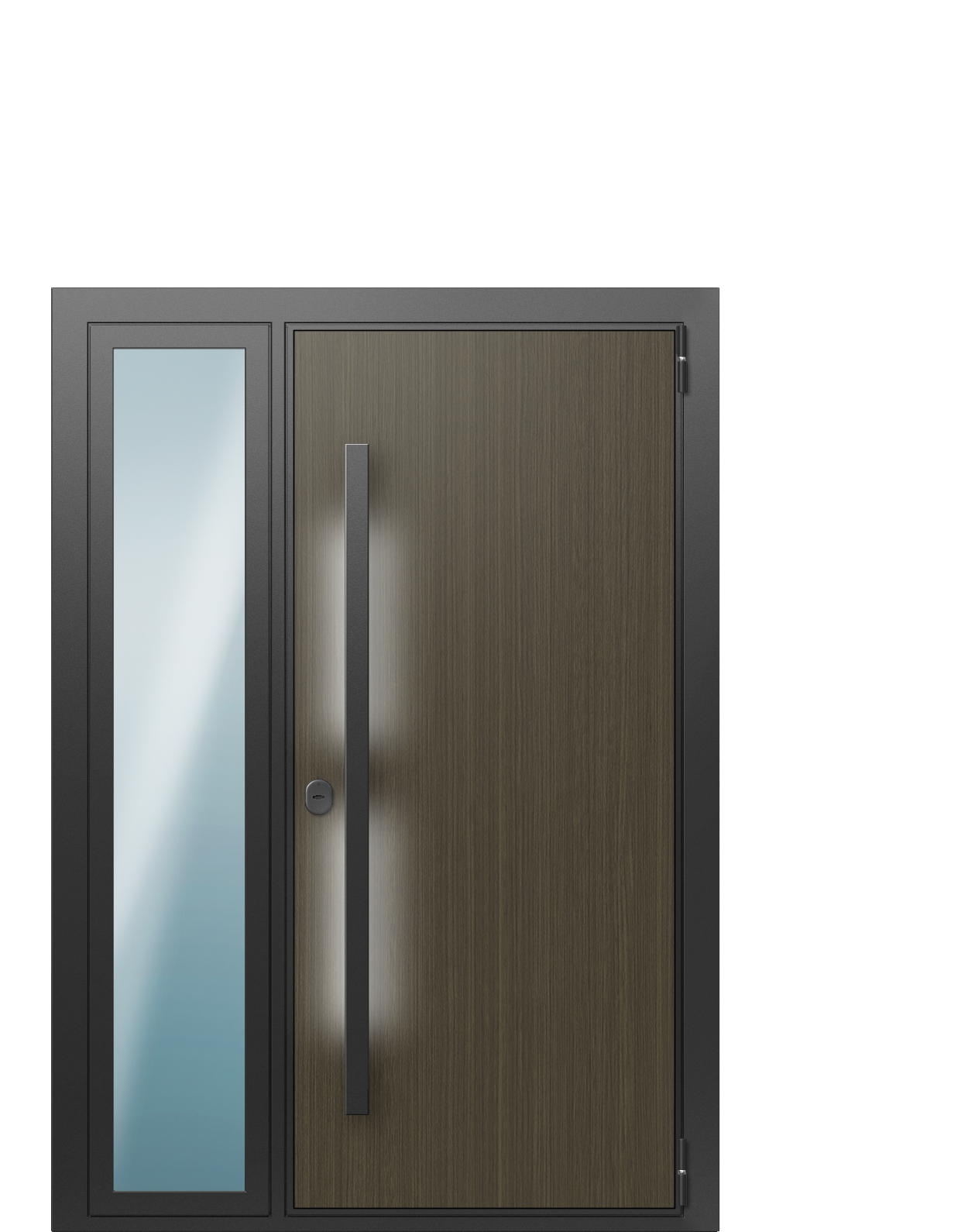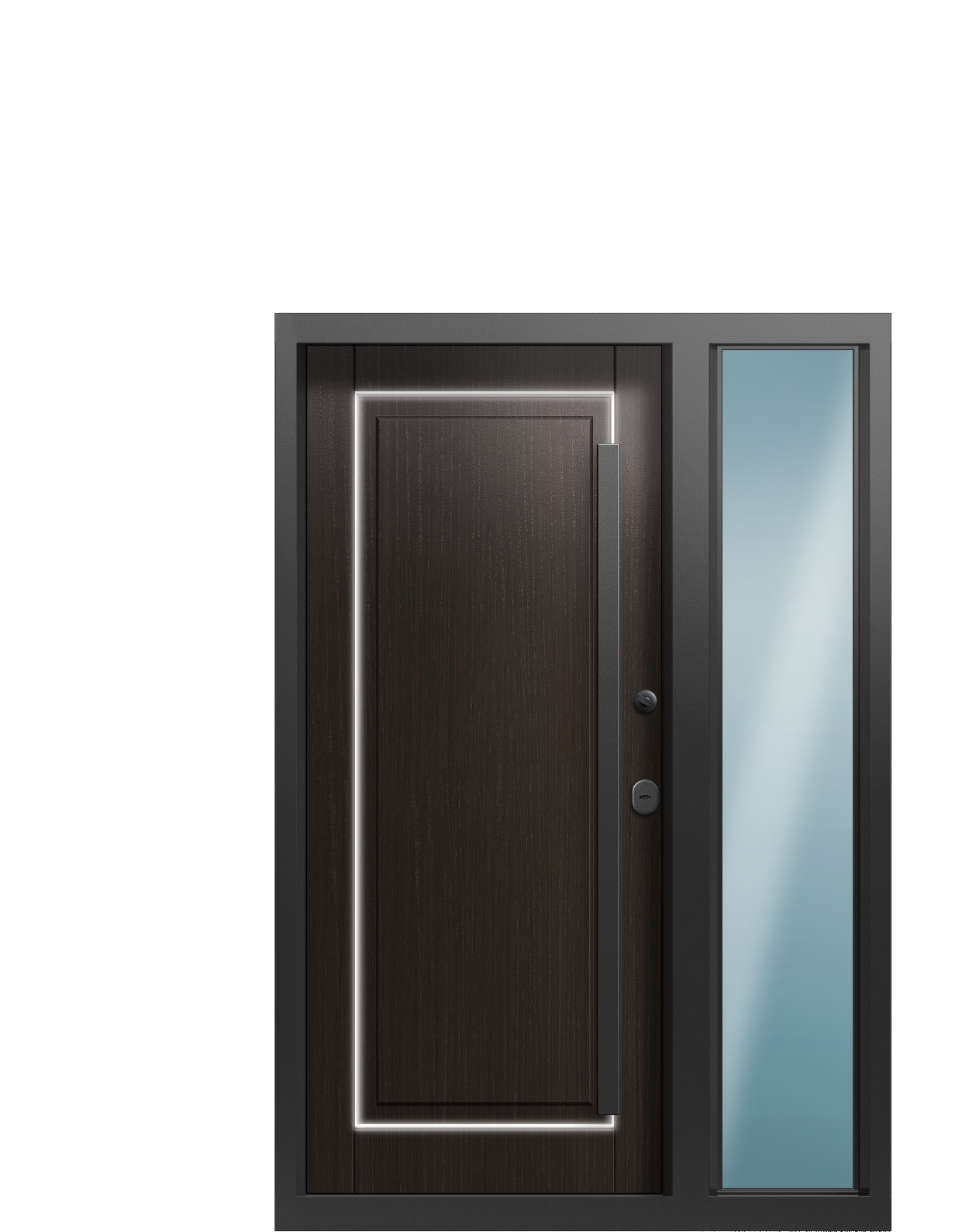 Внутренняя панель Венге Бонобо создает контраст со светодиодной лентой, разбивающей монохромную поверхность. Вертикаль фрезеровки и фрамугу подчеркивает ручка-скоба Rettangolo.