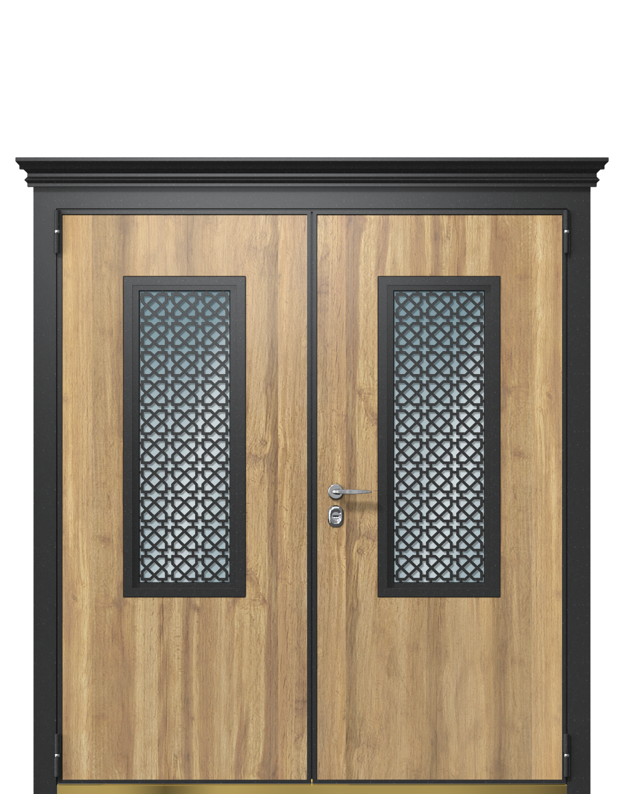Благодаря контрастному сочетанию темного цвета металла (Vesuvio) со светлыми текстурами панелей (Греческий платан и Белая Эмаль), классической фрезеровке, подчеркивающей встроенный двойной стеклопакет, дверь станет самостоятельным ярким акцентом в экстерьере и интерьере. Подчеркивает образ черная матовая фурнитура.