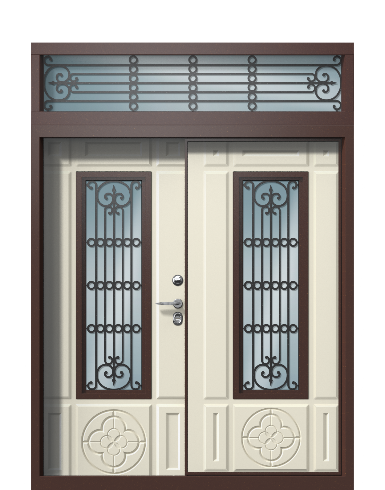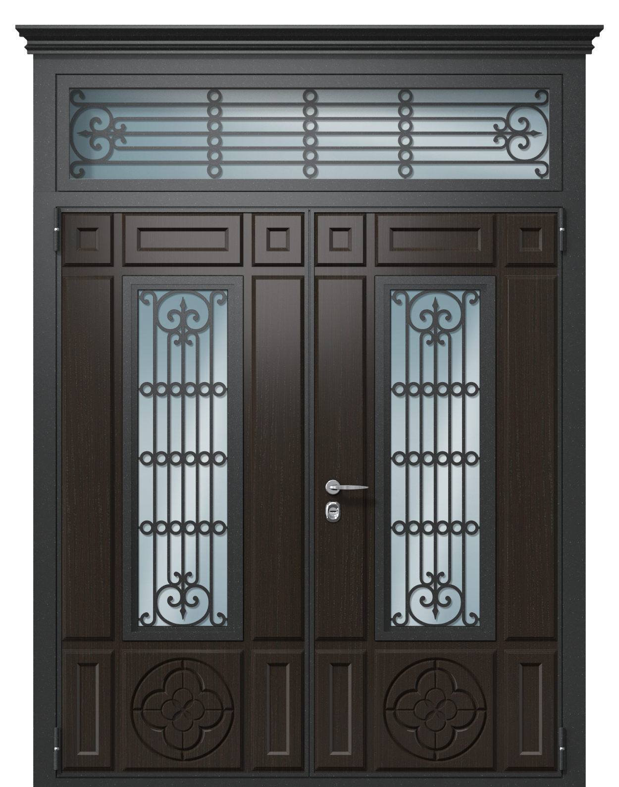 Благодаря обилию декоративных элементов (фрезеровка, остекление с решетками, карниз, фрамуга) данная модель станет самостоятельным ярким акцентом в экстерьере.