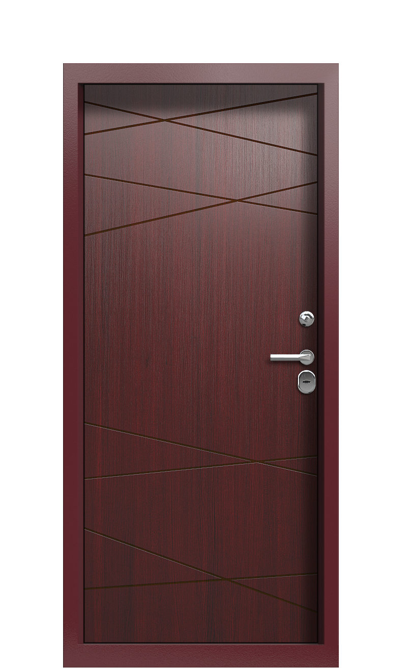 Для производства внутренней панели темно-красного оттенка использована корабельная фанера. Благородная текстура африканского дерева сейба и дуба придает входной двери изысканный вид. Фрезеровка внутренней панели — лаконичная и элегантная.