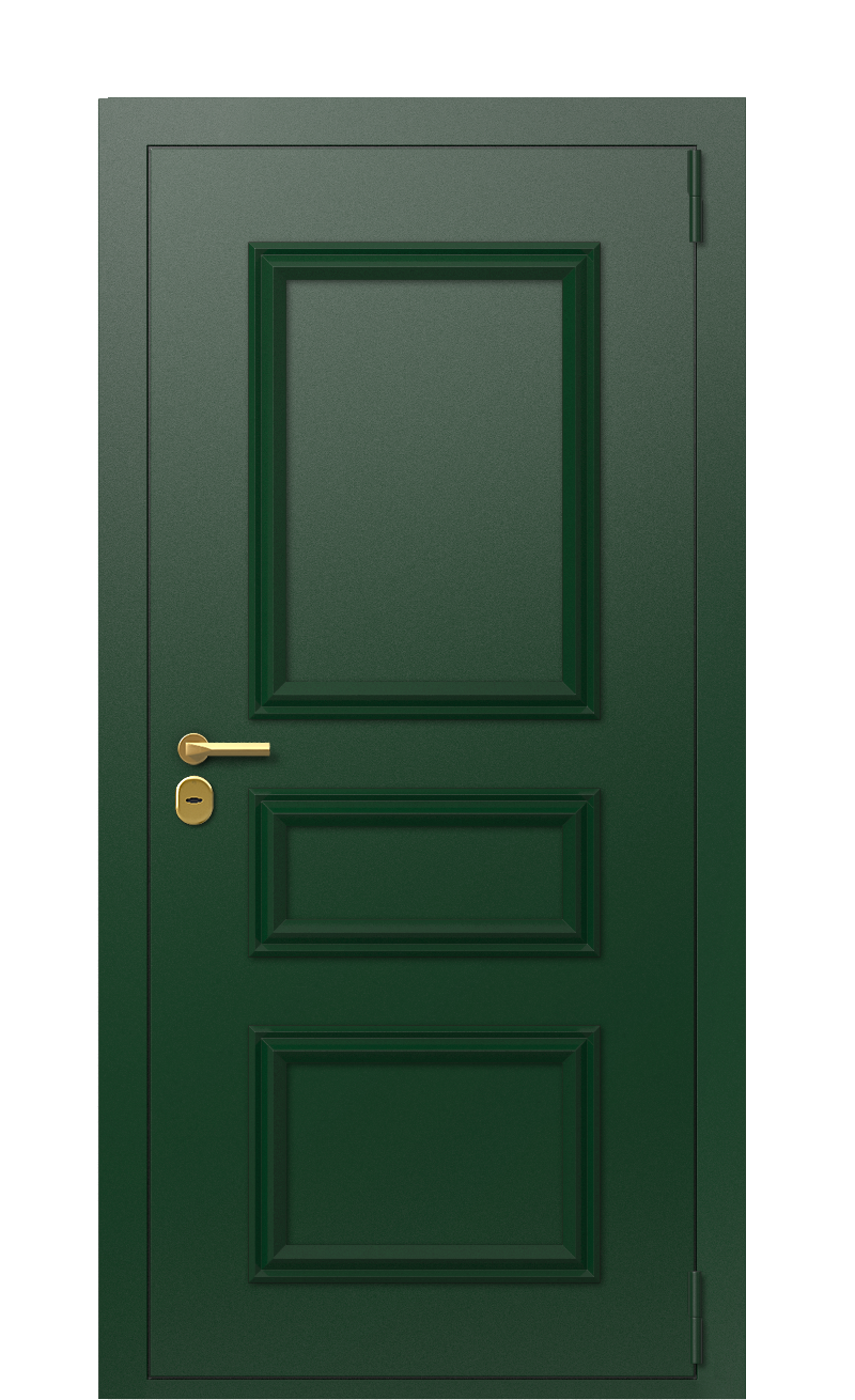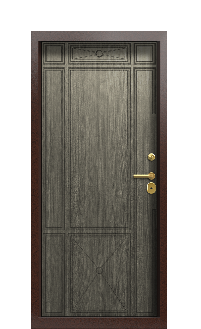 Внешняя часть этой двери изготовлена из металла, который окрашен в цвет Patina, а также украшен багетом. Внутренняя часть этой модели имеет отделку из панели WOODLINE, которая изготавливается из влагостойкой фанеры. Внутренняя поверхность двери имеет отделку Серый кварц и украшена фрезеровкой.