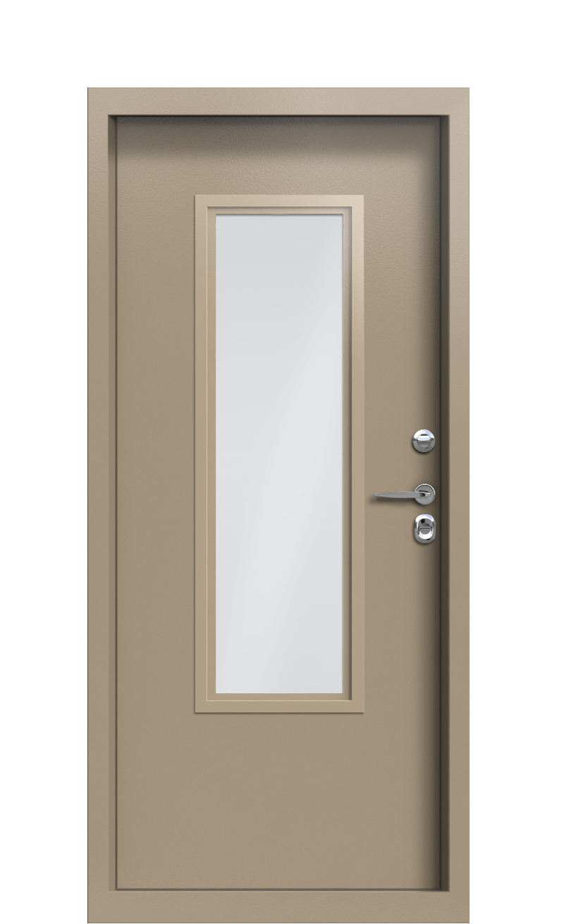 Отделка этой двери выполнена из металла с обеих сторон. Причем металл, из которого изготовлена эта дверь, покрывается не только полимерным слоем, но и слоем цинкосодержащего грунта и слоем антикоррозийного покрытия. Это обеспечивает дополнительную устойчивость данной модели к действию влаги, ультрафиолету и появлению царапин. Цвет этой двери с обеих сторон Серо-бежевый. Также она оснащена серебряным матовым остеклением.