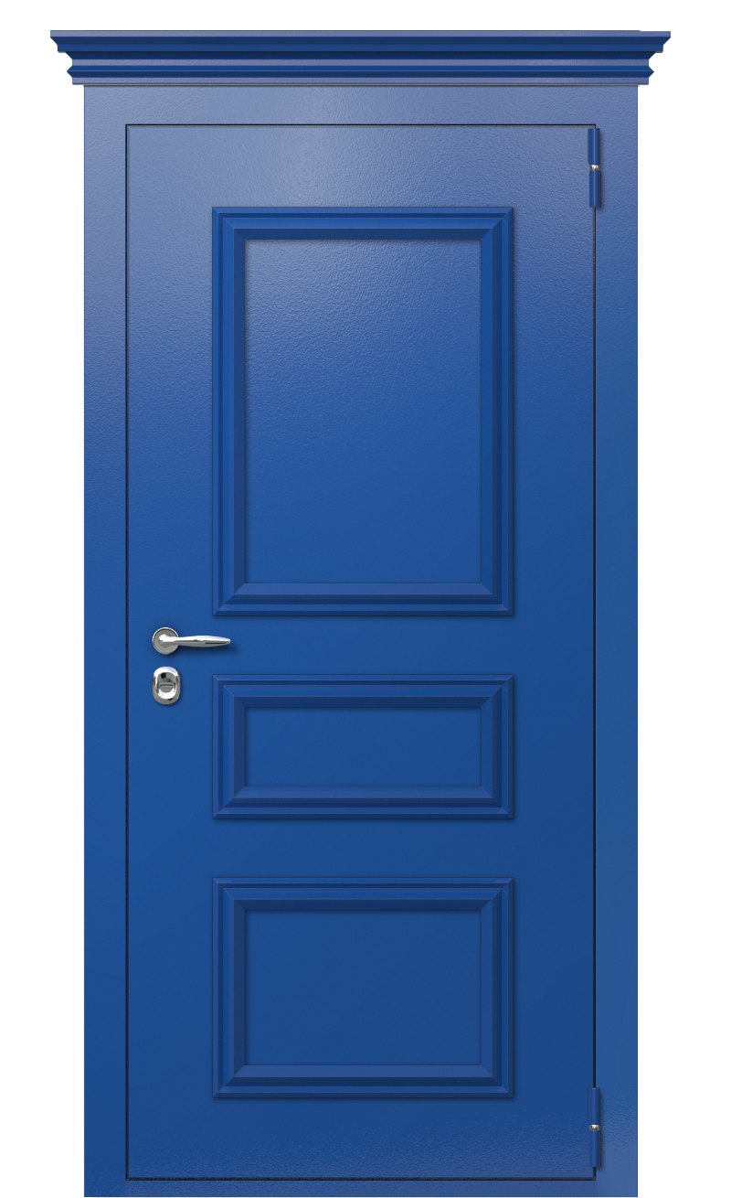 В этой модели имеется ночная задвижка и два сувальдных замка Kale. Внешняя часть входной двери украшена фрезеровкой, декоративным элементом в виде багета и окрашена в цвет Сигнальный синий. Внутренняя часть не имеет украшений и окрашена в строгий темный цвет.