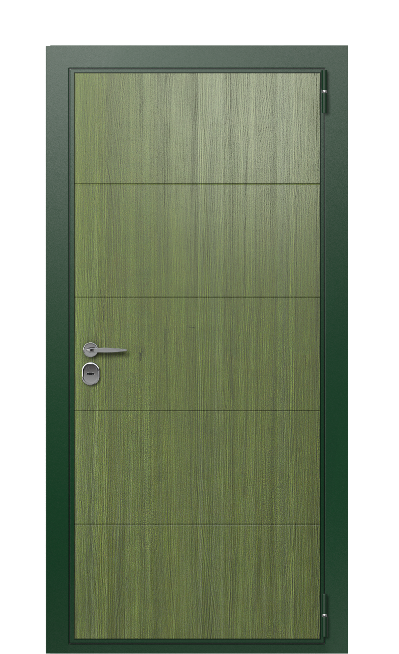 Отделка данной модели входных дверей TermoWood изготовлена из панелей WOODLINE итальянского производства, которые делают из корабельной фанеры. Отделка наружной стороны изготовлена из панели WOODLINE Темно-зеленого цвета, а отделка внутренней стороны — из панели WOODLINE Серый кварц.
