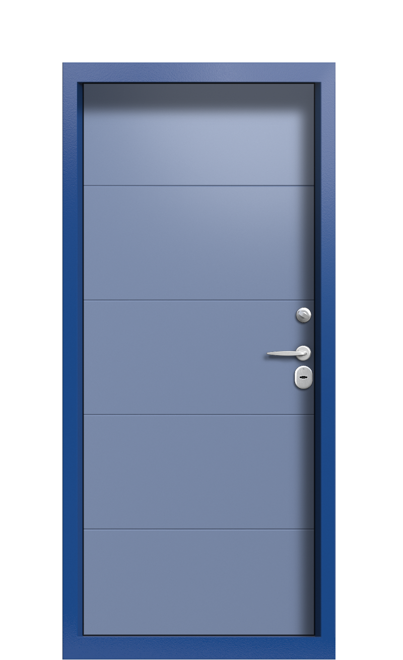 Идеальный синий оттенок напоминает спокойное небо, а в качестве акцента используется яркая рамка. Такая модель подчеркивает аккуратность, простоту стиля, при этом точно сможет выделить вход в дом как самую главную деталь экстерьера.