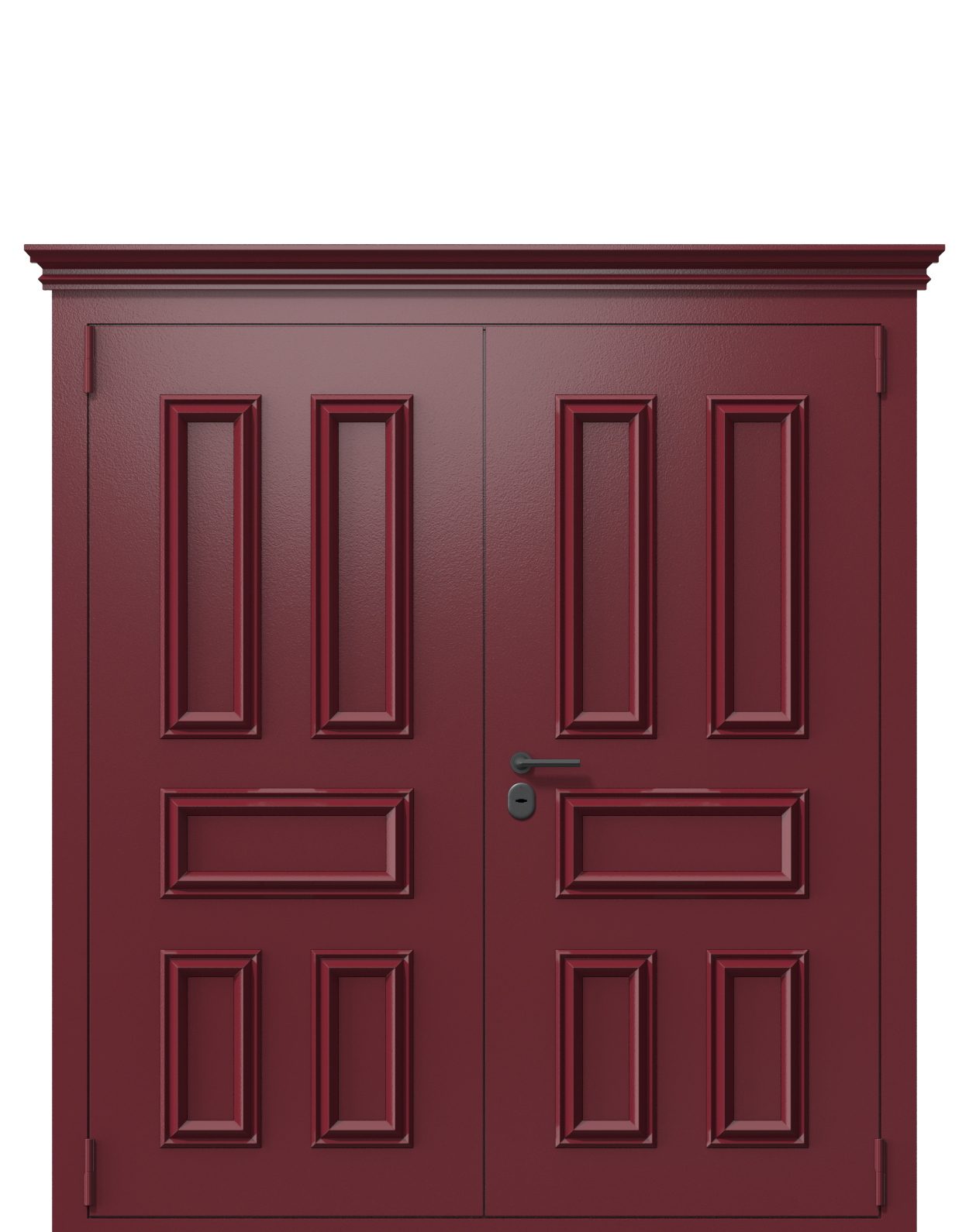 Входная дверь в коттедж TermoPlus RAL 3005, Decoline Бетон светлый - вариант для тех случаев, когда дизайн интерьера и экстерьера кардинально отличаются. Внешняя металлическая часть с полимерным покрытием в оттенке RAL 3005 станет акцентным элементом в оформлении фасада здания. Декор полотна - симметричная багетная раскладка, широкий карниз.