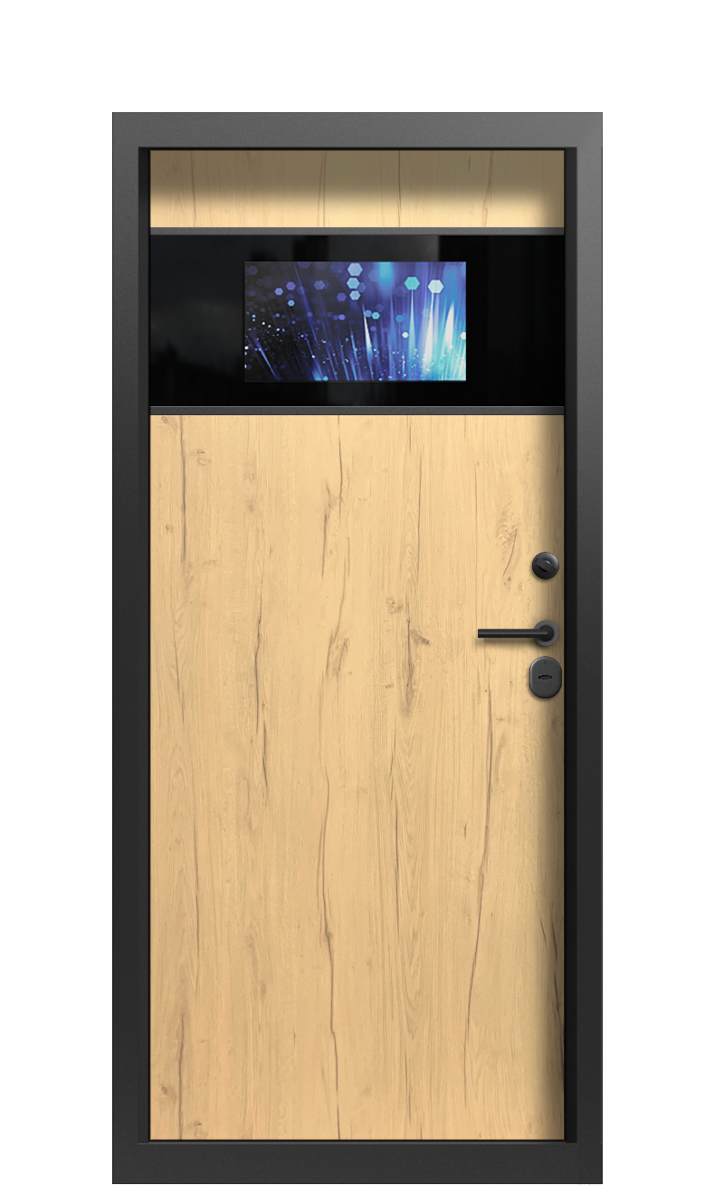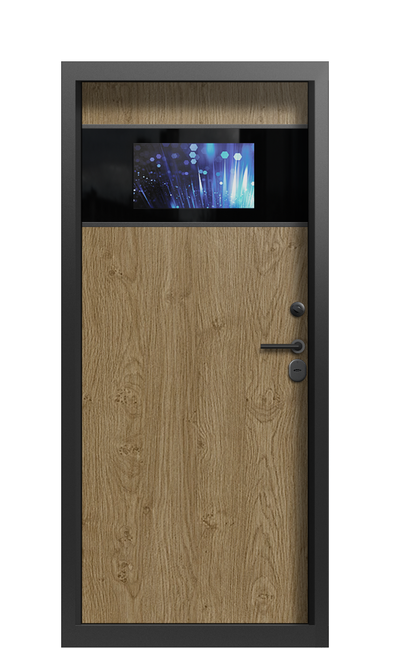Электронное решение для двери - монитор Portalle Screen. Это комбинация устройств для видеонаблюдения за территорией. Изображение с камер транслируется на встроенный внутрь полотна монитор и записывается на съемный носитель. Монитор включается при приближении к двери.