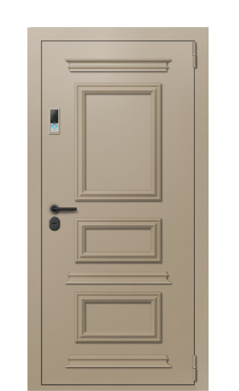 Входная дверь TermoPlus Ral 1019, Terma Дуб лофт - вариант для минималистичных интерьеров и экстерьеров в светлых оттенках. Обилие декора и элементов отсутствует - снаружи дверь украшена багетом в цвете Ral 1019; декор внутри - панель, стилизованная под текстуру натурального дерева - “Дуб лофт”. Подчеркивает дизайн черная фурнитура и контрастный цвет металлического короба внутри.