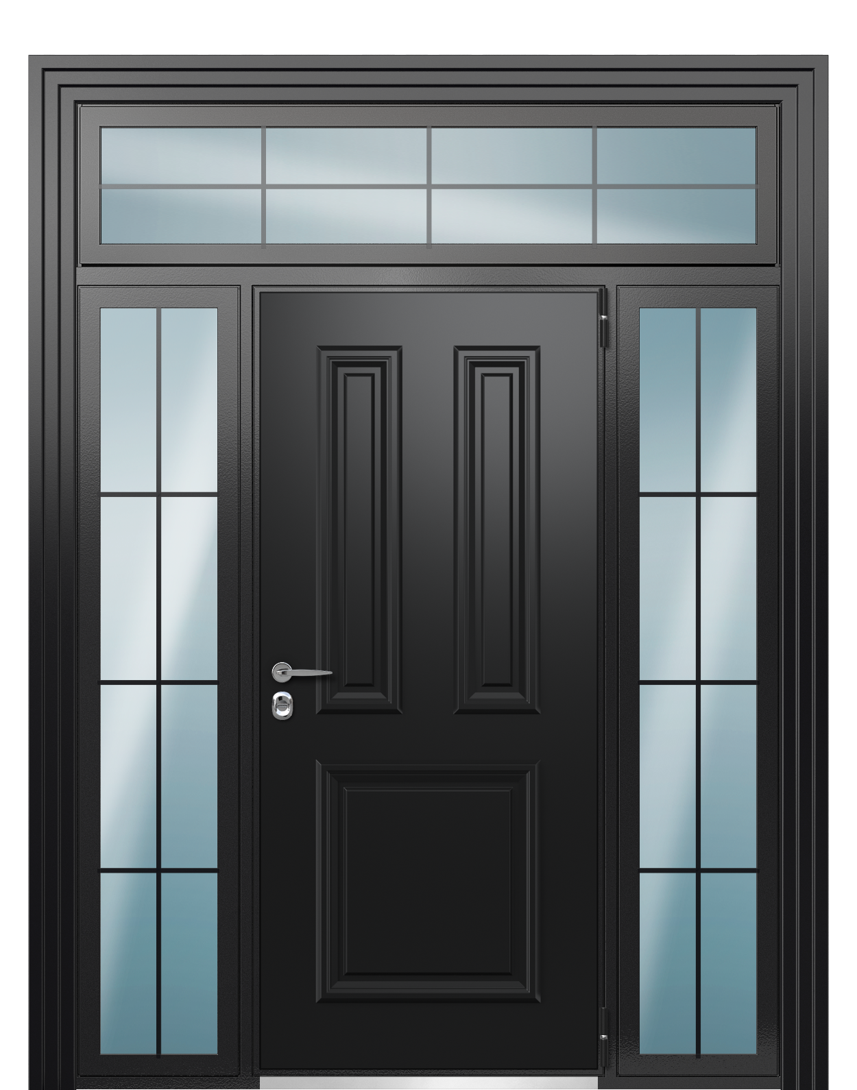 Дверь в коттедж TermoWood с боковыми и верхней фрамугами, Collori RAL 9005, Collori RAL 9003 - классическое контрастное сочетание, привлекающее своей практичностью. Темный оттенок внешней панели (RAL 9005) подходит для непредсказуемых уличных условий, а внутренняя панель в белом цвете по RAL 9003 способна визуально увеличить внутреннее пространство прихожей. Остекление фрамуг со шпросами создает дополнительное естественное освещение.