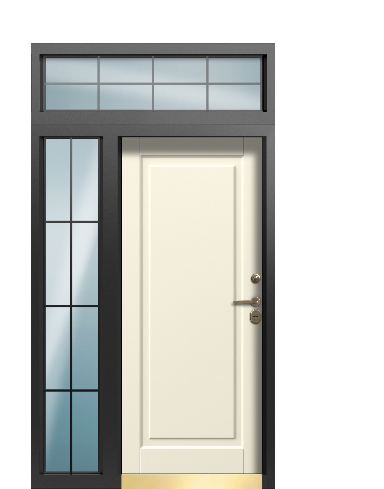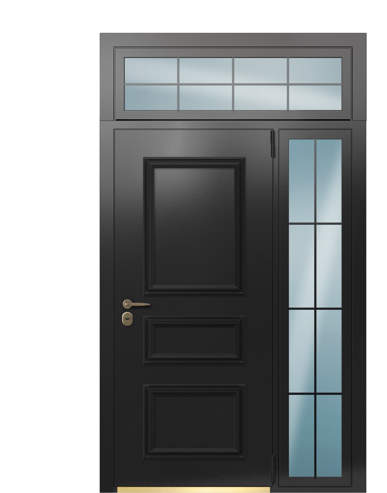 Входная дверь TermoPlus с верхней и боковой фрамугами, RAL 9005, Collori Слоновая кость купить от производителя Termo - предназначена для установки в коттедж или частный дом с нестандартным размеров дверного проема. Размеры двери можно изменить по запросу через менеджеров фабрики.