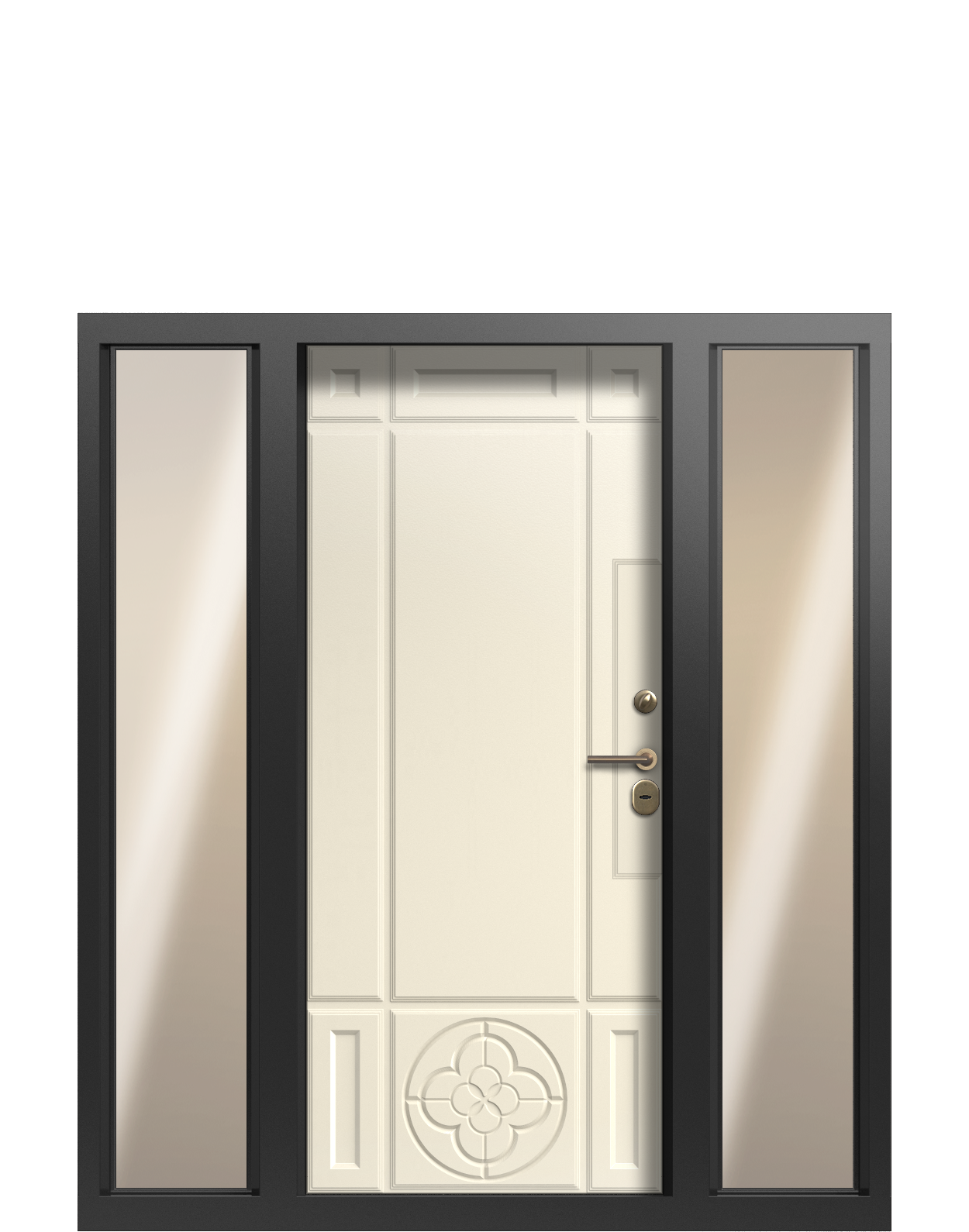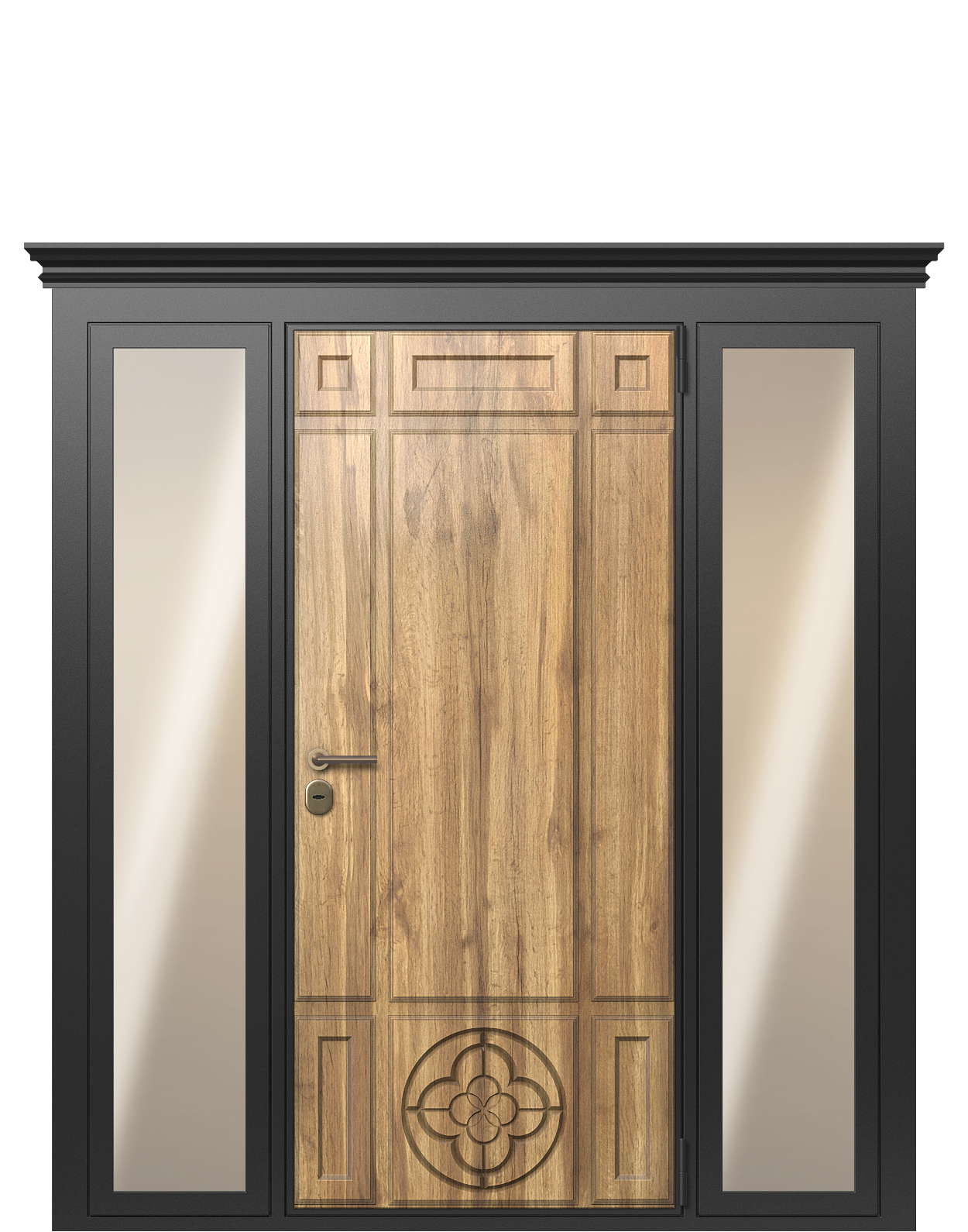Входная дверь в коттедж TermoWood с фрамугами, Decoline “Греческий платан” , Collori “Слоновая кость” - входная группа для интерьеров и экстерьеров в классическом и неоклассическом стиле. Внешняя панель Decoline в текстуре “Греческий платан” и внешняя панель Collori в оттенке “Слоновая кость”создают контрастное сочетание с металлическим профилем конструкции, благодаря чему цветовое решение входной группы становится рельефным. Декоративное оформление двери представлено объемным карнизом и решетками “Азия”. Дизайн дополняет ручка Venera в цвете “бронза”.