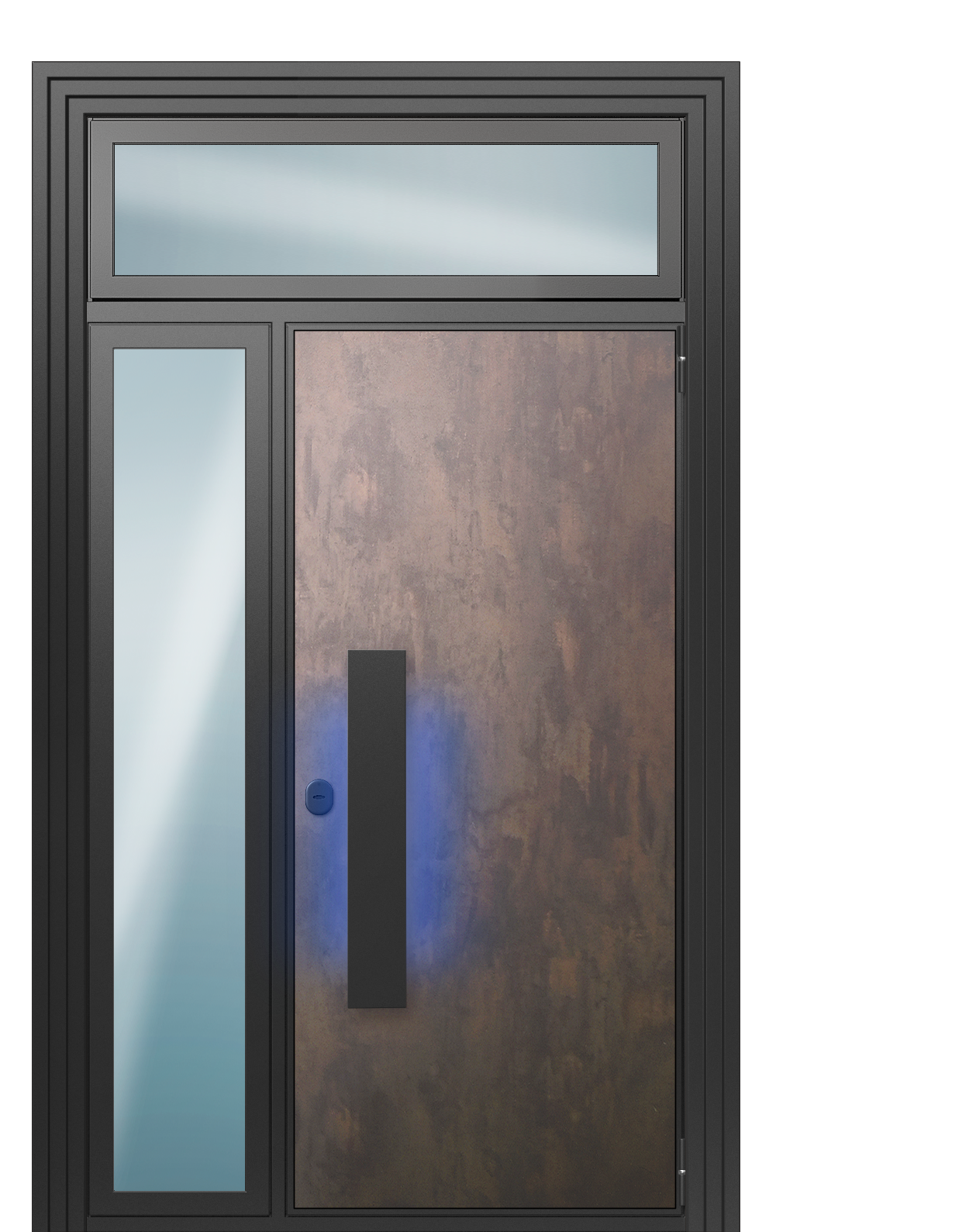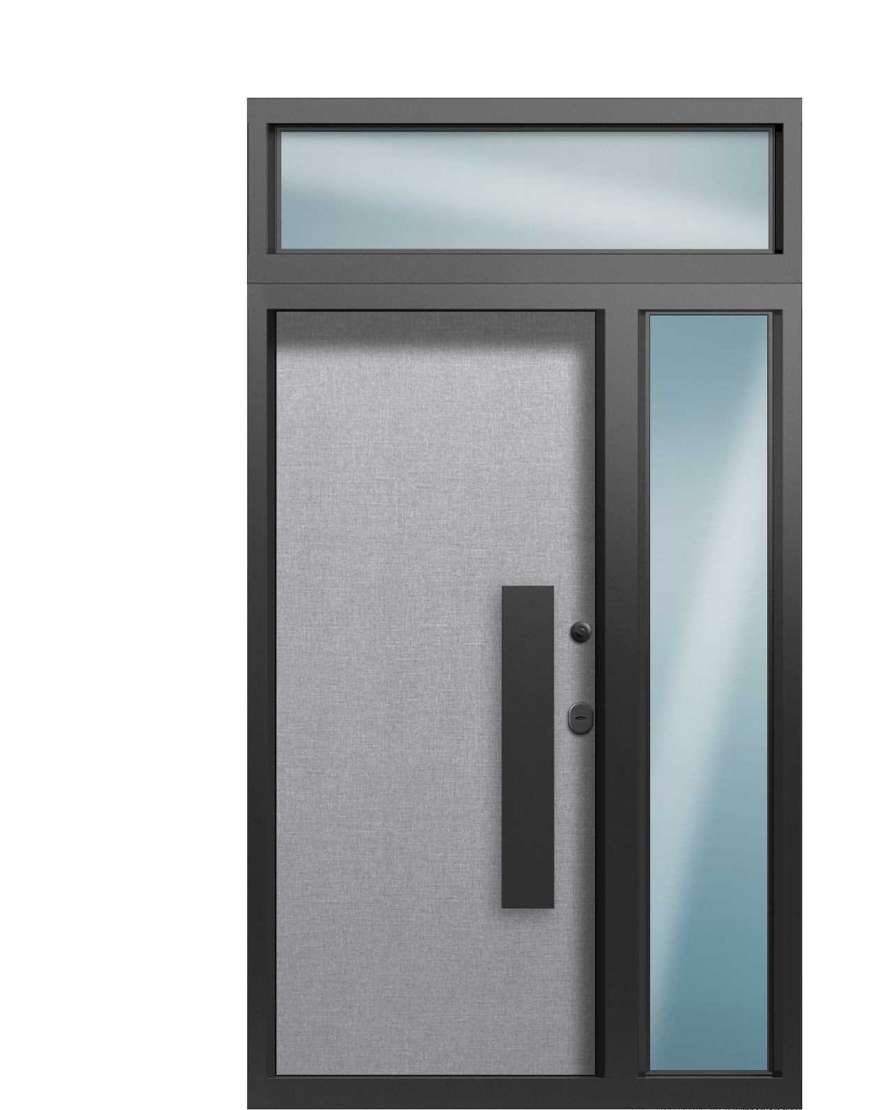 Современная входная дверь в коттедж или частный дом TermoWood с верхней и боковой фрамугами, Termo Марсианский камень, Termo Лен маренго - решение для лофт и андеграунд экстерьеров и интерьеров, где акцент сделан на нестандартные цветовые сочетания.