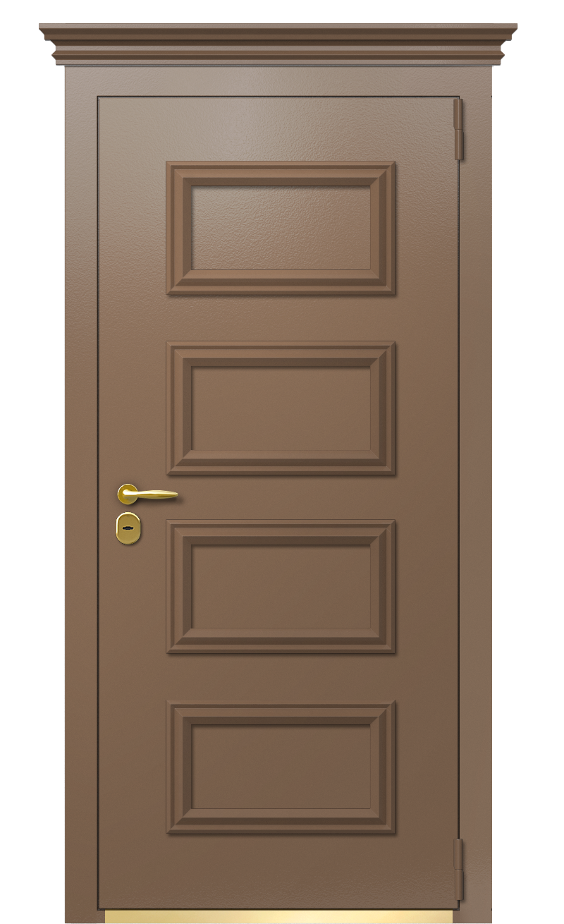 Снаружи отделка этой модели входных дверей выполнена из металла, окрашенного в Бледно-коричневый цвет. Также имеются декоративные элементы в виде багета, карниза и нержавеющего порога. Внутренняя сторона этой двери сделана из панели Woodline Пепельный, которая производится из корабельной фанеры.