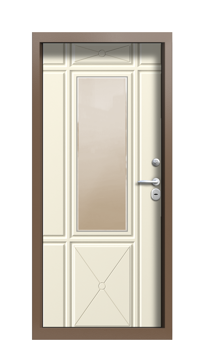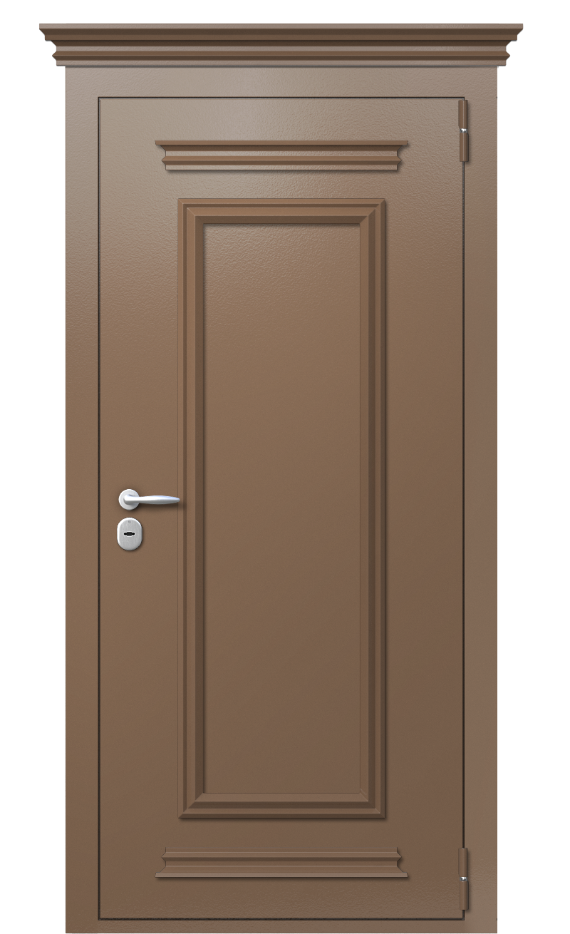 В качестве наружной отделки используется металл с полимерным покрытием оттенка Ral 8025, имитирующий дерево, но при этом устойчивый к влаге, механическим повреждениям и перепадам температур. Поверхность двери не выцветает на солнце и сохраняет эстетическую ценность даже при интенсивной эксплуатации. Устойчивость к царапинам и коррозии обеспечивает цинкосодержащий грунт AKZONOBEL.
