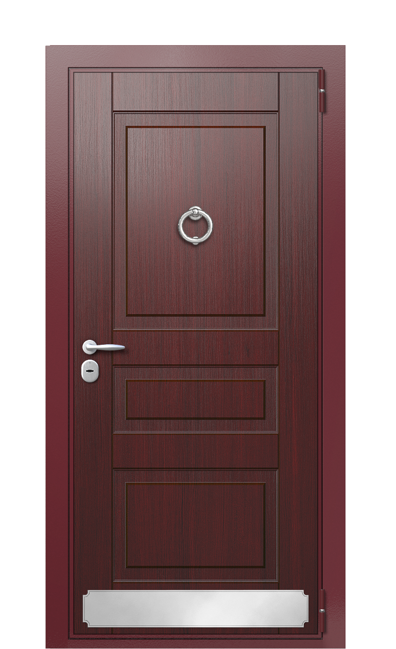 Дверь TermoWood Ral 3005 состоит из внешней и внутренней панели. Они изготовлены из африканского дерева сейба и дуба, которые ранее применялись при строительстве корабельных палуб. Также дверь сделана из панелей МДФ с пленкой ПВХ. Поэтому среди преимуществ этой модели: влагостойкость, высокая прочность, длительный срок службы, экологичность. Что касается защиты от воров, то ее обеспечивает два замка и наличие ночной задвижки. Поэтому двери можно смело устанавливать с внешней стороны коттеджей, домой и квартир.