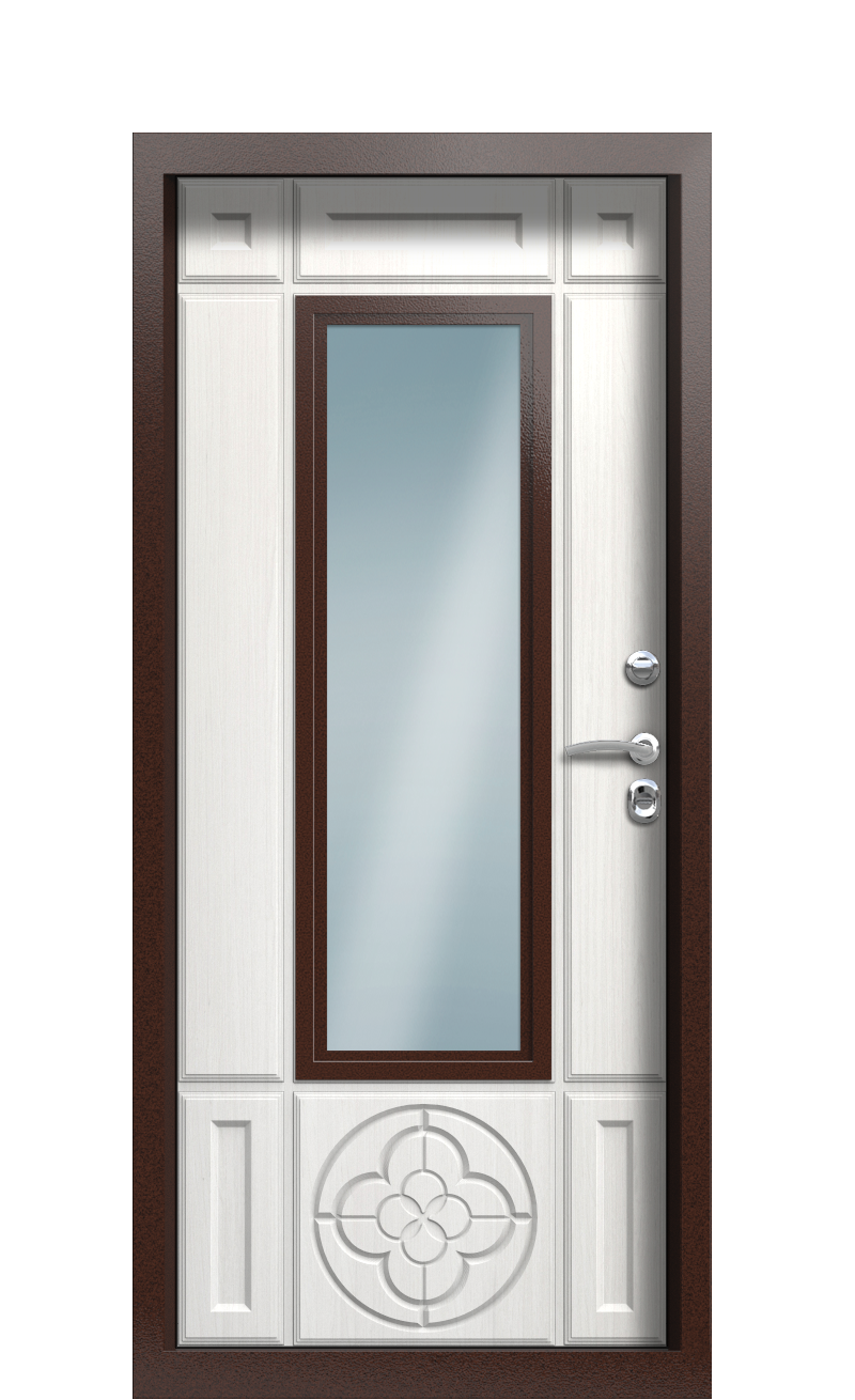 Дверь TermoPlus Bronze Белое Дерево 955 с индивидуальным двухцветным дизайном украсят интерьер и экстерьер вашего частного дома. Внешняя привлекательность – это не единственное достоинство: конструкция такого типа обладает высокой теплоэффективностью.Дверь изготовлена из качественных долговечных материалов. Конструкция продумана, поэтому выполняет функции сохранения тепла даже в самые суровые зимы. Внутри установлен терморазрыв в виде пробкового листа. Он не допускает контакта между внутренней теплой и наружной холодной частями металла. В результате мостики холода не образуются, полотно не промерзает.Два турецких замка Кале сувальдного типа надежно защищают помещение от взлома и проникновения посторонних. Изнутри дверь запирается ночной задвижкой.Для внешней отделки использован гладкий металл, окрашенный полимерной краской в цвет Bronze. Обшивка внутренней части выполнена панелями Decoline Light, покрытыми пленкой ПВХ с текстурой под натуральную древесину и цветом Белое дерево. В центральной части с обеих сторон установлено прямоугольное прозрачное стекло.Морозостойкие конструкции с терморазрывом можно приобрести на фабрике Термо. После установки нашей двери вы забудете о проблемах сквозняков, промерзания и обледенения полотна.