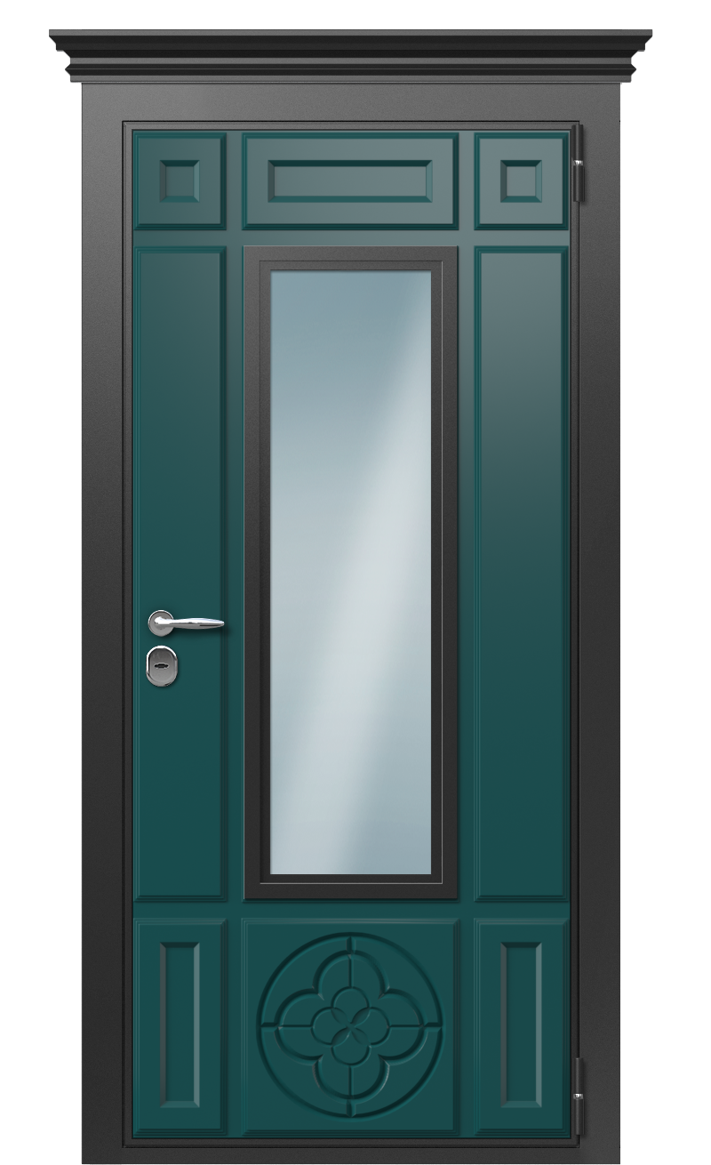 Дверь TermoWood Collori Зеленое сукно Vesuvio Карниз сохранит тепло в частном доме или загородном коттедже даже в самых суровых климатических условиях. В отличие от стандартных входных конструкций, она не промерзает, не покрывается льдом и не деформируется под действием неблагоприятных погодных факторов. Это возможно благодаря терморазрыву, который прерывает тепловой обмен между наружной холодной и внутренней теплой частями металла.Сувальдные замки от итальянского бренда Securemme защищают помещение от взлома и вскрытия разными способами. Они просты в эксплуатации и долговечны.Для отделки используются декоративные панели Collori, устойчивые к влаге, ультрафиолету и выцветанию. Поверхность окрашена в цвет Зеленое сукно. В верхней части установлен карниз. Прозрачное прямоугольное остекление украшает каждую из сторон. Узоры в виде решетки выполнены фрезеровкой.Фабрика Термо предлагает купить качественные входные двери, надежно защищающие от холода и взлома. Предлагаем множество готовых решений, готовы работать по индивидуальному проекту. Доставим изделие в любую точку России.