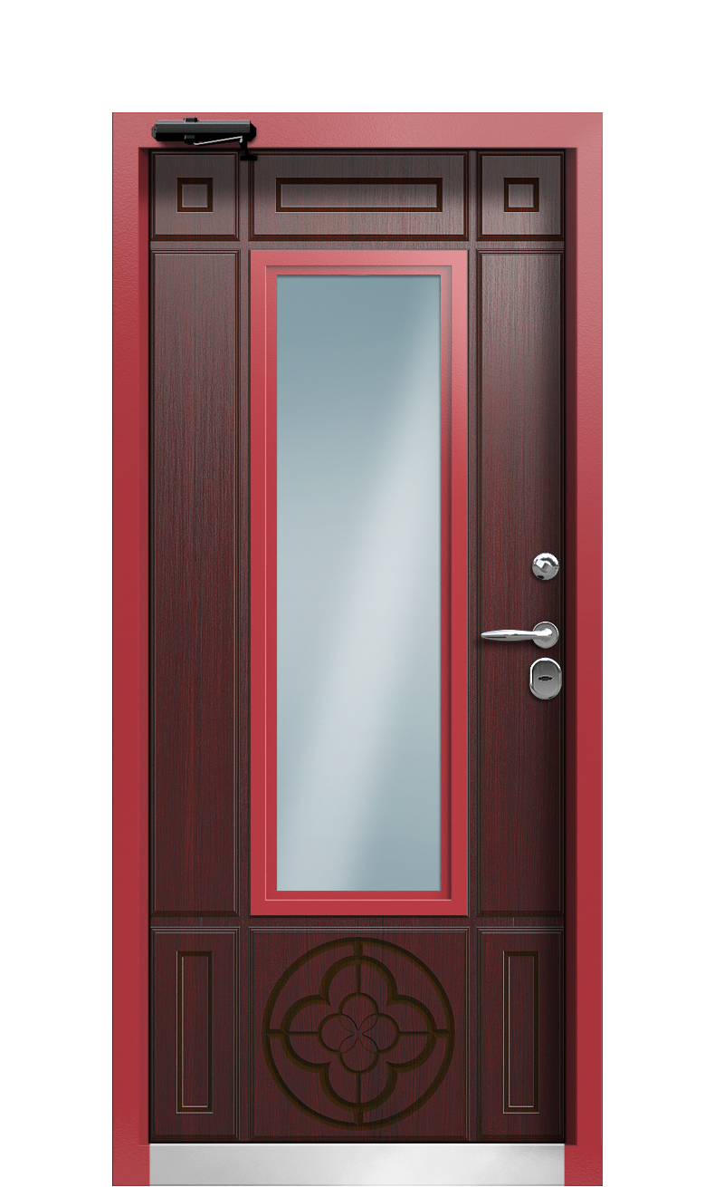 Не вызывает нареканий и уровень защиты двери TermoWood Ral 8017 Грецкий Орех 430, сопоставимый с банковским. Дополняет общую картину качественная фурнитура, эффектные зеркальные вставки и защитный порожек из нержавейки в нижней части короба.