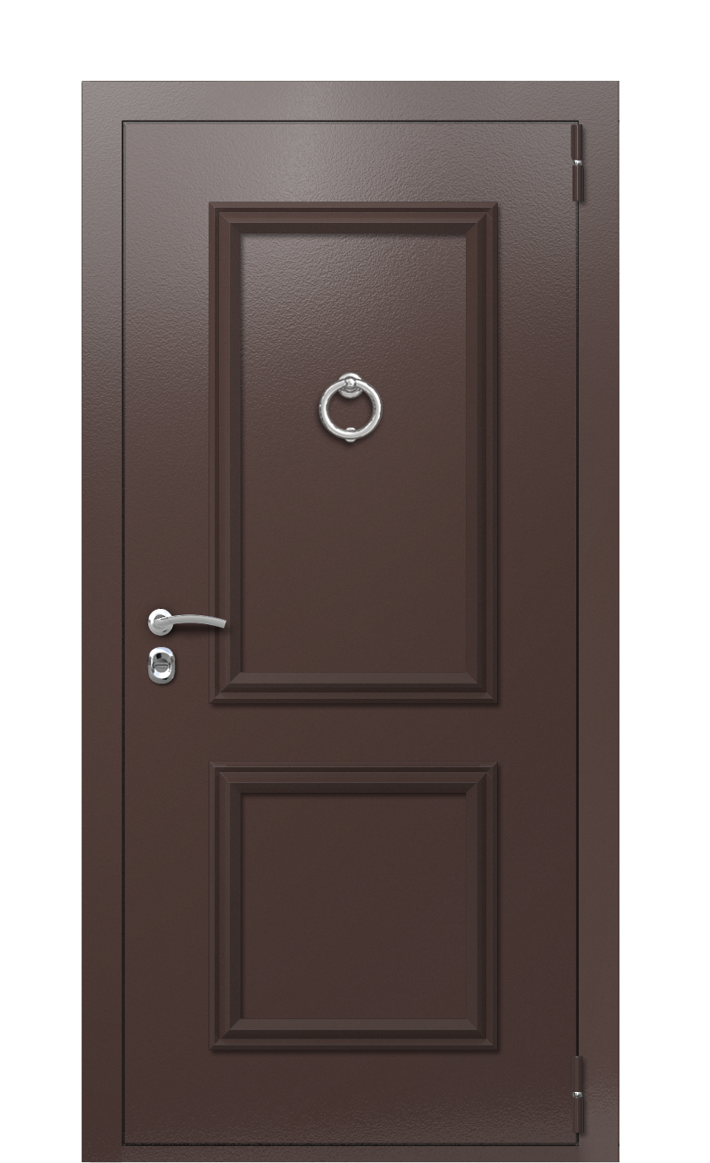 Отдельного внимания заслуживает отделка двери Termo Ral 8017 Kale 1454, получившая классическое исполнение. Так, фасадную сторону полотна украшают багеты и фигурный дверной молоток в цвете хром. Внутренняя панель гладкая – без фрезеровки и декора, но такая изящная простота гармонирует с глубоким шоколадным цветом и фурнитурой изделия.