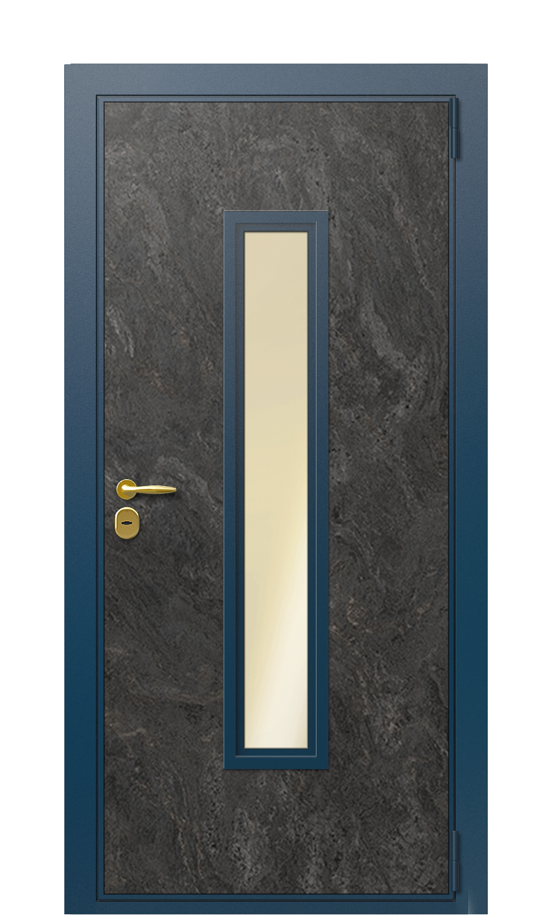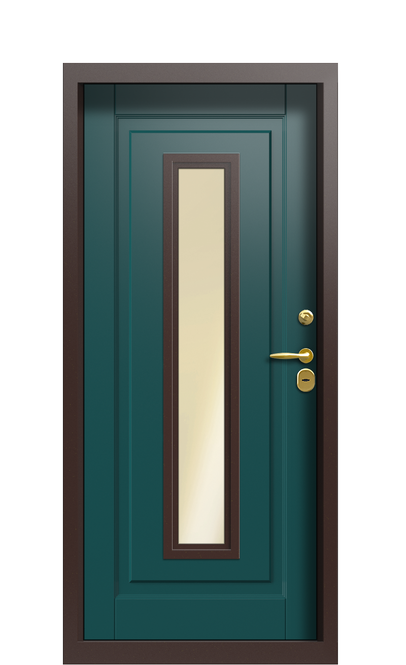 Отделка этой входной двери выполнена из панелей. Наружная часть сделана из панели Terma Premium+ Темный мрамор, которая изготовлена из влагостойких листов МДФ, покрытых пластиком HPL. Внутренняя часть изготовлена из панели Collori, которая сделана из влагостойкой ДВП, окрашенной эмалью в цвет Зеленое Сукно. Данная модель имеет золотое остекление и полозоченную фурнитуру. Безопасность обеспечивается при помощи основного и дополнительного сувальдных замков Securemme.