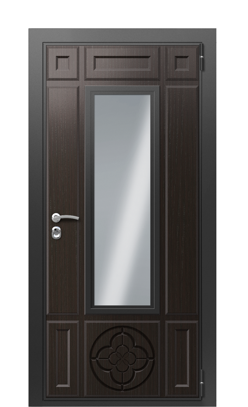 Внутренние и внешние панели украшены фрезеровкой, а также угольным остеклением. Дизайн внутренней стороны в цвете Кофейное дерево смотрится благородно и дорого. Покрытие внешней панели оттенка Vesuvio — светостойкое, не выгорает даже под воздействием прямых солнечных лучей. В базовую комплектацию включен надежный сувальдный замок Kale.