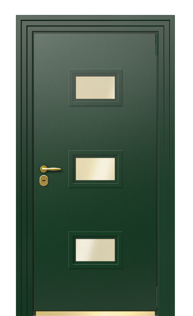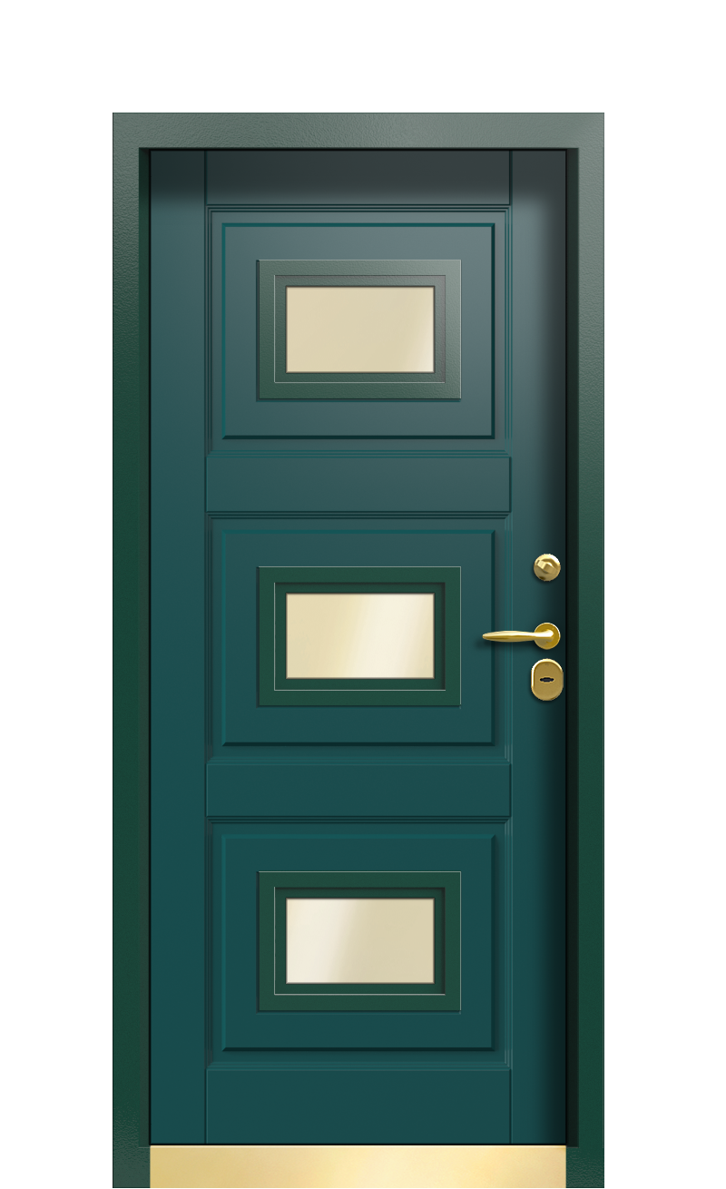 Производитель Termo предлагает входную дверь TermoPlus Patina Зеленое сукно 1103, украшенную золотым остеклением и оснащенную нержавеющим порогом. Эта модель идеально подходит для установки в частном доме. Она характеризуется высоким сопротивлением к холоду за счет наличия многослойной теплоизоляции, терморазрыва коробки и плотна, греющего кабеля, который включается автоматически при наступлении холодов. Она очень плотно примыкает к дверной коробке благодаря наличию уплотнителя KIM ТЕС, который также обеспечивает хороший уровень звукоизоляции и способствует плавному закрыванию двери.