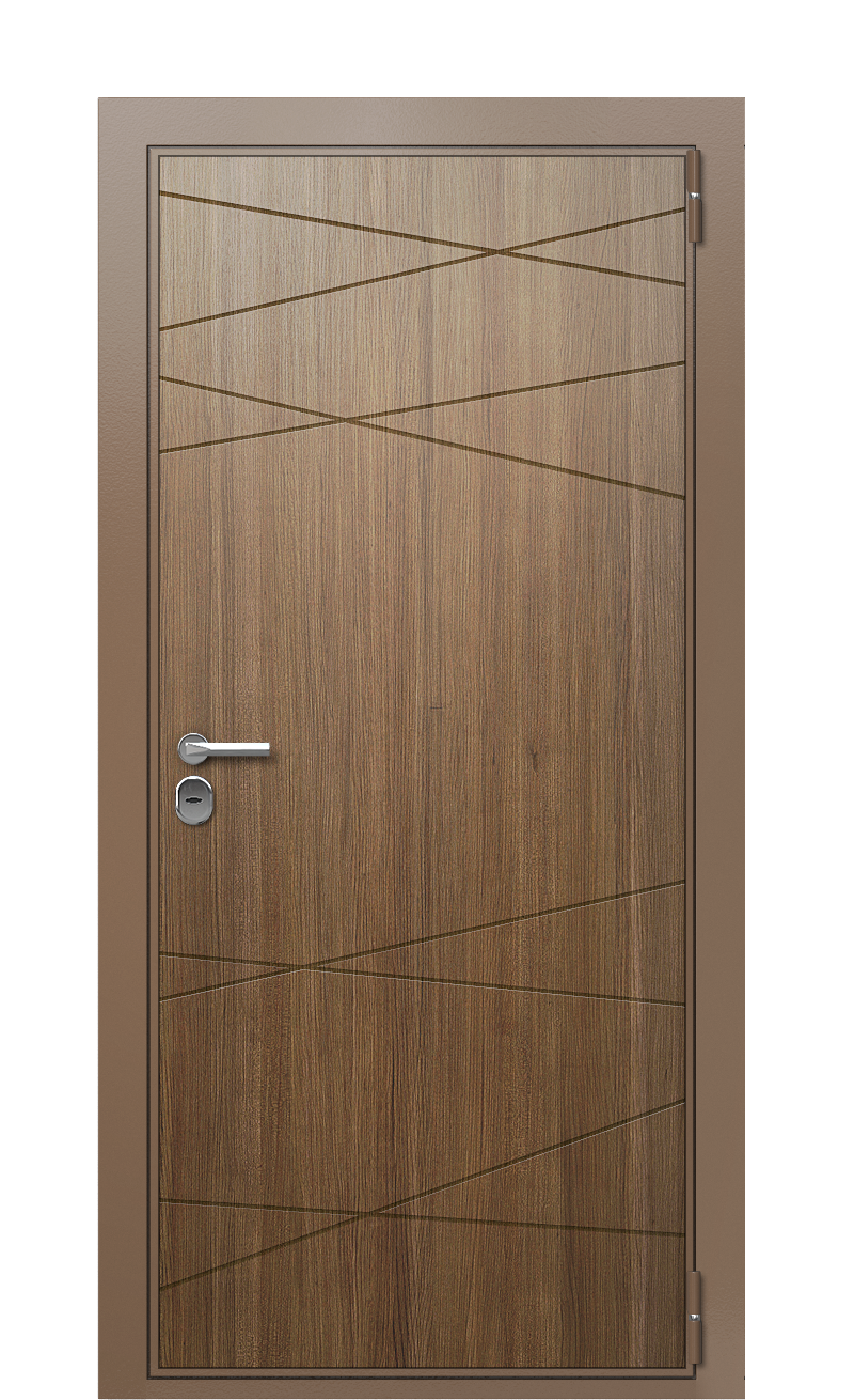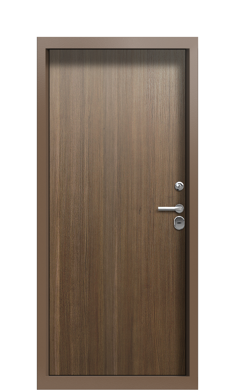 Внешняя и внутренняя панели двери изготовлены из корабельной фанеры. Текстура дуба и африканского дерева сейба выглядит благородно и дорого. Цвет Ral 8025 Тик реализован при помощи полимерного покрытия с антикоррозийной основой.