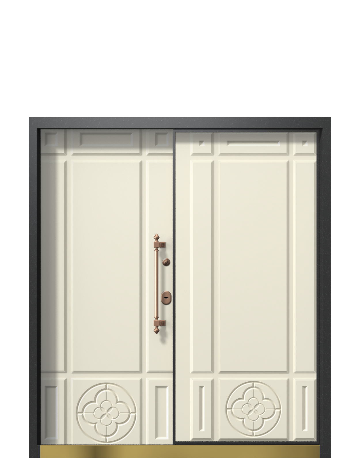 Дизайн внешней панели - элементы из массива дуба на фрезерованной панели Woodline в оттенке Серый антрацит. Woodline - это панели из корабельной древесины, которой производят отделку яхт класса “люкс”. Патинирование декоративных элементов в сочетании с бронзовой ручкой “Venera” и накладным порогом в цвете бронза создают эффектный цветовой рельеф, который усиливает классическая глубокая фрезеровка. Внутренняя панель в нежном цвете “Слоновая кость” усилит дизайн светлых прихожих.